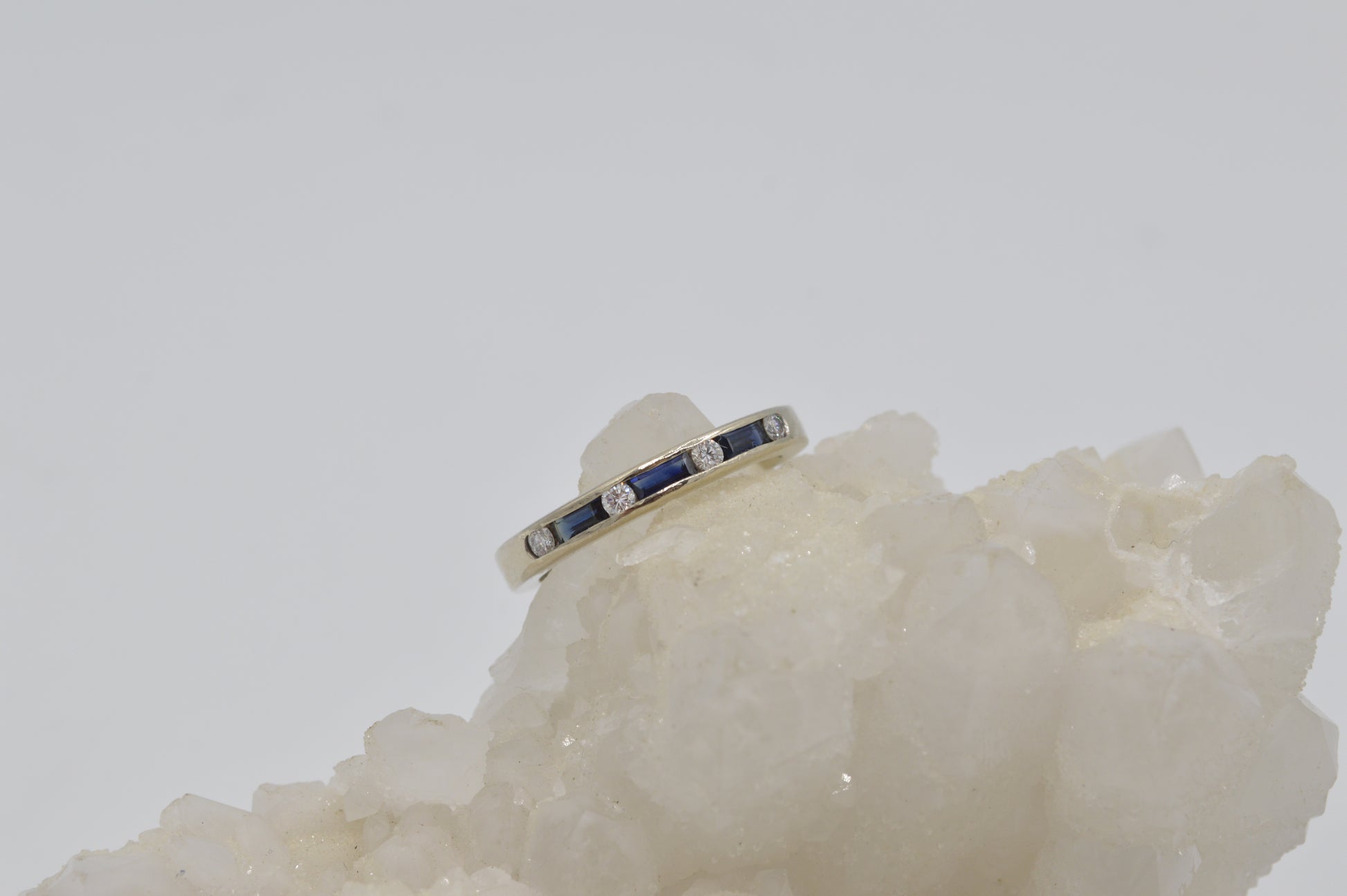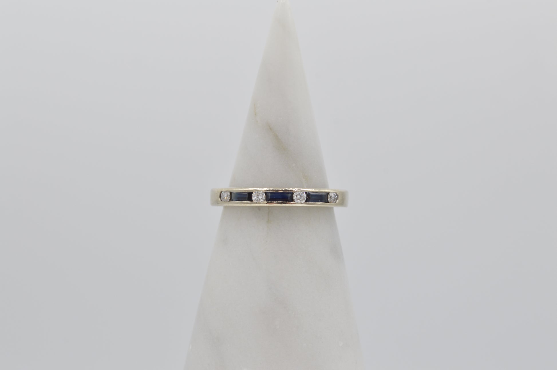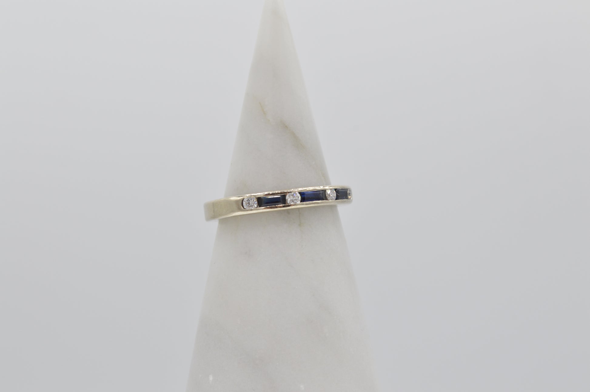 Diamond – 0.12ctw, round cut & Sapphire, baguette cut.